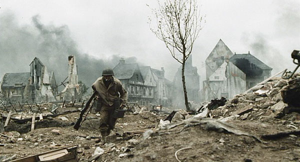 One of the most heavily criticized scenes in the film, the Battle of Ramelle is not a textbook example of how a German unit would attack a small defending force in the rubble of a village. The closing battle is designed to support the plot and the drama, and not represent a history lesson on German tactics. A good example is the belltower that Jackson and Parker set themselves up in. Although the structure had obviously already been hit before, the tower itself was still intact and made a perfect sniper's nest. Before entering the village the Germans should have leveled that tower in order to deny their defender's a place from which to fire on them.